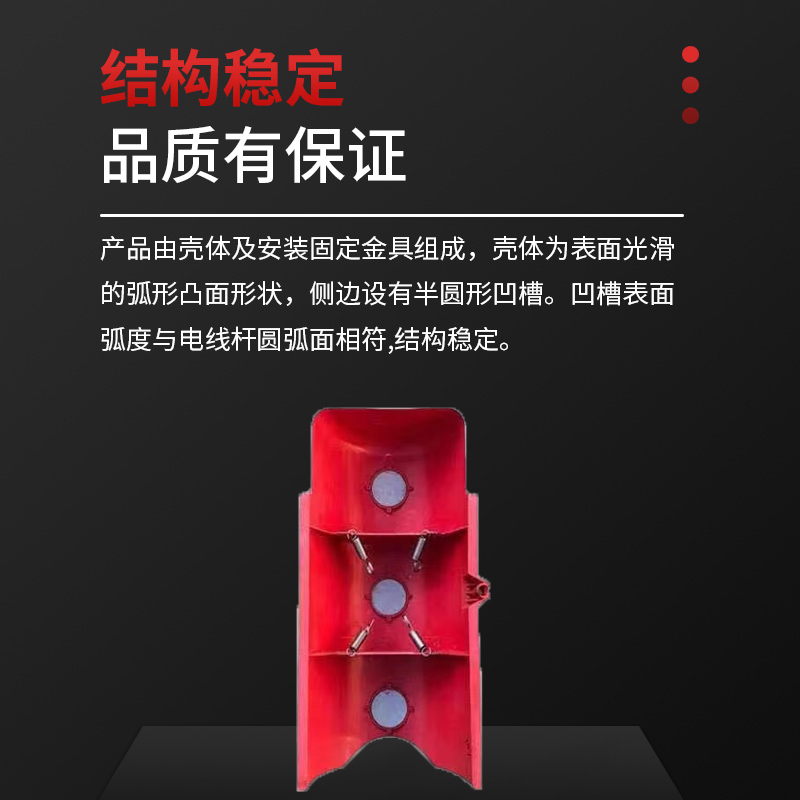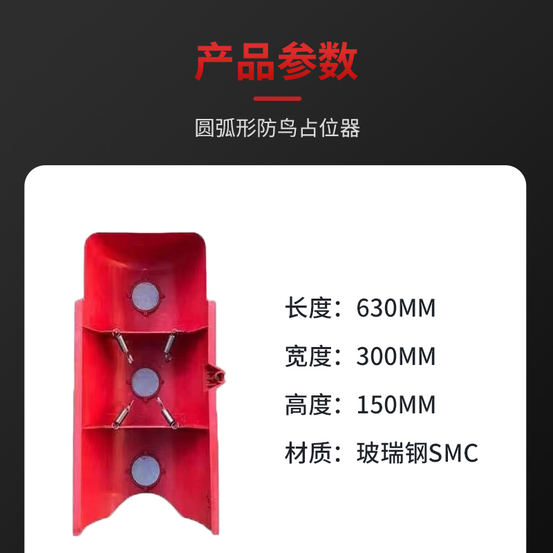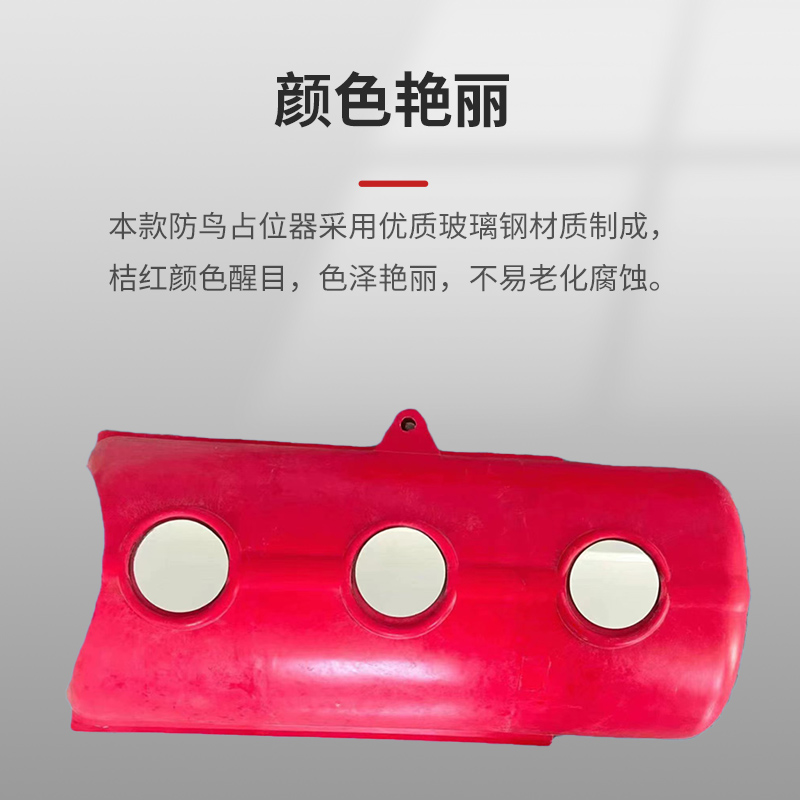 占位器为玻璃钢材质, 新型防鸟害占位器有以下特点:一是防鸟筑巢效果好。较之传统的驱鸟器时间久了鸟儿产生一定的适应性,不能够达到良好的驱鸟效果,而防鸟刺由于安装高度和安装位置问题,不适宜安装在配电线路上等弊端,新型防鸟害占位器通过遮蔽滑落的方式避免了鸟类在线路杆塔上筑巢,从而达到有效的防止鸟害的目的。二是使用寿命长,直接经济效益明显。新型防鸟害占位器采用新型耐老化复合材料,使用寿命达到10年以上。与传统的风车式驱鸟器1-2年的使用寿命相比较,大大延长了使用周期,减少了维护工作量,极大的缩减了防鸟害的经济成本。三是不停电安装。新型防鸟害占位器由于结构合理,材料绝缘,安装方式便捷,无须停电即可完成安装,能够为公司创造良好的社会效益。